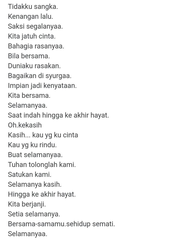 Ku akan tetap setia menunggumu Ku tahu kau hanya untukku. Bagai beribu batu kau di sana. Aku kan bertahan selalu bertahan sampai waktu memanggilku 27112014 ku ingin kau tahu diriku di sini menanti dirimu meski ku tunggu hingga ujung waktuku dan berharap rasa ini kan abadi untuk selamanya dan ijinkan aku memeluk dirimu kali ini saja tuk ucapkan selamat tinggal untuk selamanya dan biarkan rasa ini bahagia untuk sekejab saja.